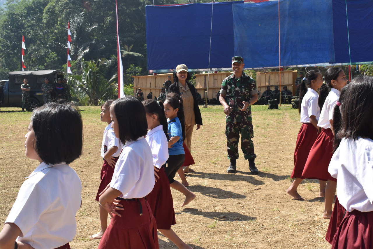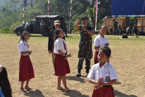 Terlihat Kepala Sekolah SDN 1 Pasegeran, Umi Saidah (49) dan Kapten Rasto dari Kodim 0704 Banjarnegara, memberikan semangat kepada para pelajar tersebut dalam melaksanakan gladi ebeg H-1 jelang penutupan.