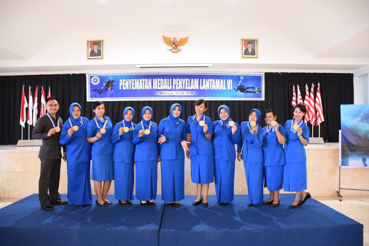 Makassar – Ketua Koordinator Cabang (Korcab) VI Daerah Jalasenastri Armada (DJA) II Ny. Risanti Dwi Sulaksono mengalungkan medali penghargaan kepada para penyelam Lantamal VI terkhusus ibu ibu Jalasenastri dan pengurus yayasan Hangtuah, penyematan dilaksanakan di Gedung Hasanudin Rabu 10/07/2019.