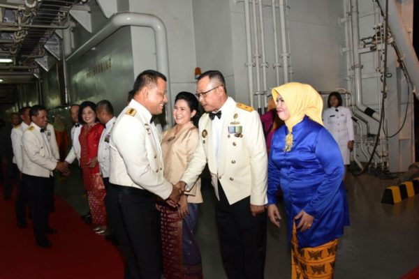 PB|Surabaya – Panglima Komando Armada RI Kawasan Timur (Pangarmatim) Laksamana Pertama (Laksma) TNI Didik Setiyono, S.E., M.M., didampingi Ketua Daerah Jalasenastri Armatim (KDJAT) Ny. Retno Didik Setiyono menghadiri acara Fleet Day Dinner, bertempat di KRI Banjarmasin-592 yang bersandar di Dermaga Semampir II Koarmatim, Ujung Surabaya. Senin, (04/12/2017).