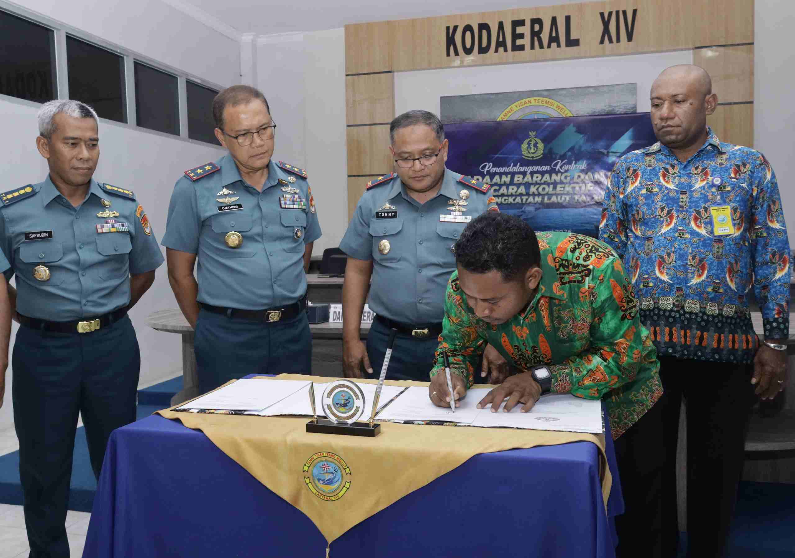 Sorong. Bertempat di Ruang Vicon Mako Komando Daerah TNI Angkatan Laut XIV (Kodaeral XIV) Distrik Sorong Manoi, Kota Sorong Papua Barat Daya, Komandan Komando Daerah TNI Angkatan Laut XIV (Komandan Kodaeral XIV), Laksamana Muda TNI Djatmoko, S.T., M.M., CHRMP, yang didampingi Wadan Kodaeral XIV Laksamana Pertama TNI Tomy Herlambang dan para pejabat utama terkait, secara virtual mengikuti pelaksanaan Penandatanganan Kontrak Secara Kolektif TA 2026 dengan Mitra Penyedia Barang dan Jasa yang disaksikan langsung Kepala Staf Angkatan Laut (Kasal) Laksamana TNI Dr. Muhammad Ali, S.E., M.M., M.Tr.Opsla dan Wakil Kepala Staf Angkatan Laut (Wakasal) Laksamana Madya TNI Erwin S. Aldedharma, S.E., M.M., M.Sc., dari Auditorium Denma Mabesal Cilangkap Jakarta Timur, Selasa (27/01/2026).