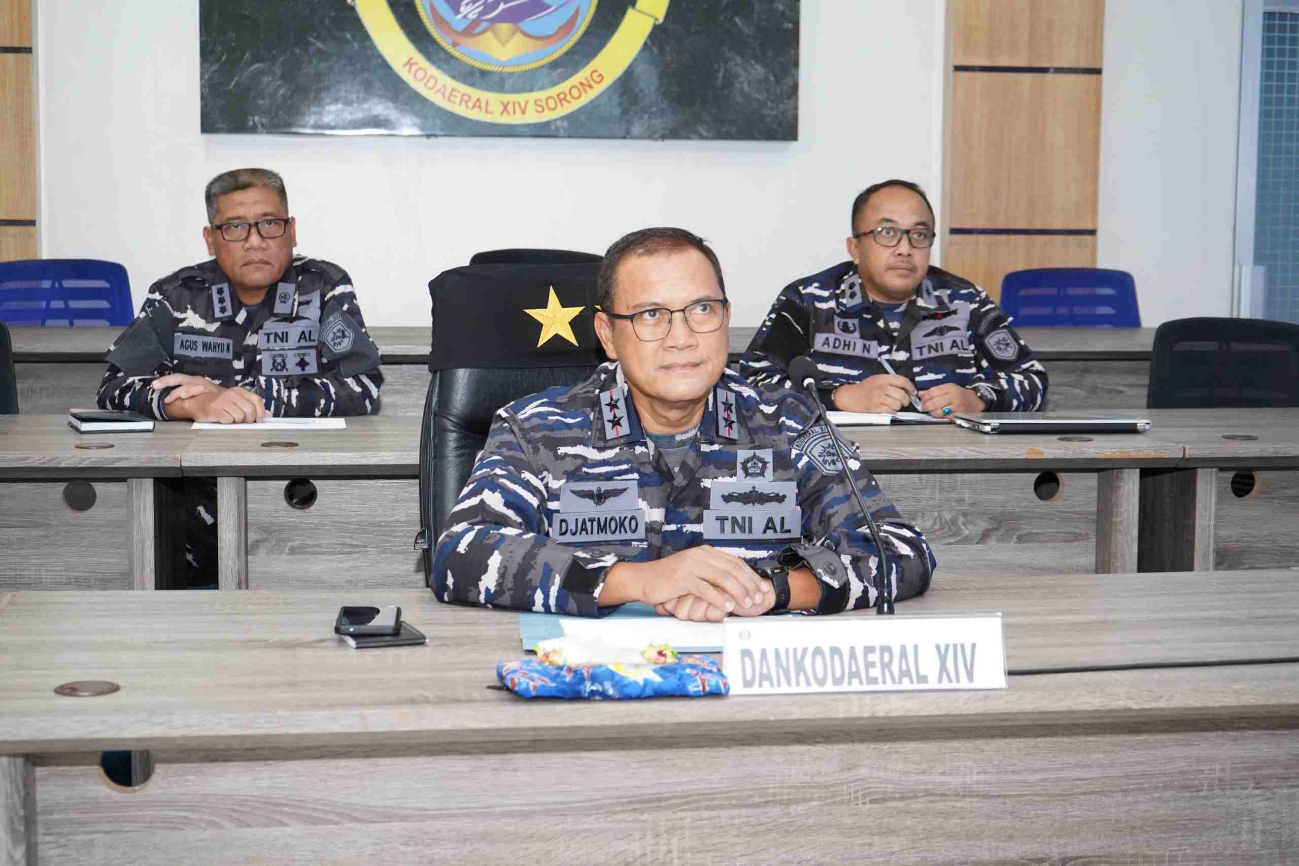 Sorong – Bertempat di Ruang Vicon Mako Kodaeral XIV, secara virtual, Komandan Komando Daerah TNI Angkatan Laut XIV (Komandan Kodaeral XIV), Laksamana Muda TNI Djatmoko, S.T., M.M., CHRMP yang didampingi Inspektur Kodaeral XIV, Kolonel Laut (S) Agus Wahyu Nugraha, S.E.,M.M., dan Irops Kodaeral XIV Letkol Laut (P) Adhi Nugroho menghadiri Taklimat Akhir Audit Ketaatan, Audit Kinerja, dan Audit Tata Kelola Itjen TNI Periode I TA 2026 di Ko/Sat TNI di wilayah Papua Barat dan Papua Barat Daya, adapun kegiatan tersebut dipusatkan dari Ruang Yudha Makodam XVIII Kasuari Manokwari yang diikuti secara virtual oleh satuan lainnya. Jumat (27/02/2026).