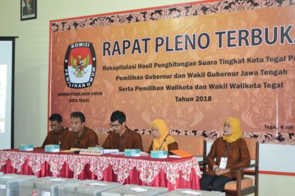 PB|Tegal – Bersama Dandim 0712 dan Kapolresta, Komandan Pangkalan TNI Angkatan Laut (Danlanal) Tegal, Lantamal V Letkol Laut (P) Agus Haryanto SE.M.Tr.Hanla menghadiri Rapat Pleno Sidang Terbuka Rekapitulasi Pilkada Serentak 2018 di gedung KPUD Kota Tegal Jl. Sembodro No. 20 Kelurahan Slerok Kec. Tegal Timur, Rabu, (4/7)