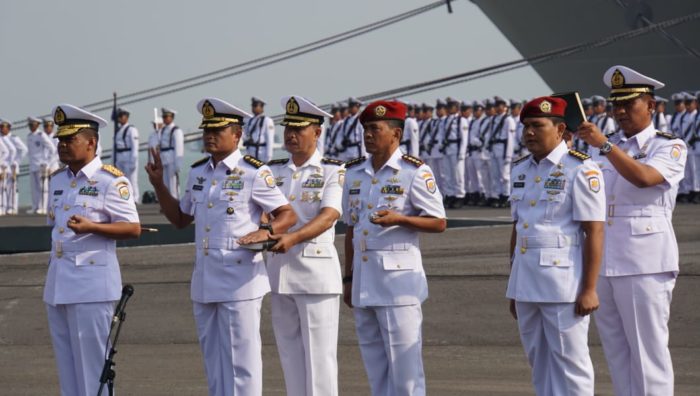 PB|Surabaya – Komandan Pangkalan Utama TNI AL (Danlantamal) V Surabaya V Laksamana Pertama TNI Edwin, S.H., didampingi Ketua Korcab V DJA II Ny. Wenny Edwin menghadiri Upacara Sertijab Danlantamal XIII/Trk dan Sertijab Dansatkopaska Koarmada II yang dilaksanakan di Dermaga Madura Ujung Koarmada II Surabaya, Rabu (11/7).