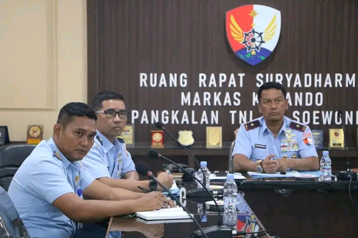 Medan — Komandan Lanud Soewondo Marsma TNI Tio Hutapea, S.Sos., M.A.P. didampingi Kadisops Lanud Soewondo, Kolonel Pnb Firmandes Pasaribu, S.T., M.Han. beserta staf Lanud Soewondo mengikuti rapat antisipasi pemberlakuan Undang-Undang Pertahanan Ruang Udara (UU PRU) dalam rangka penanganan pasca force down di jajaran Komando Operasi Udara Nasional (Koopsudnas) secara daring. Kamis (30/10/2025).