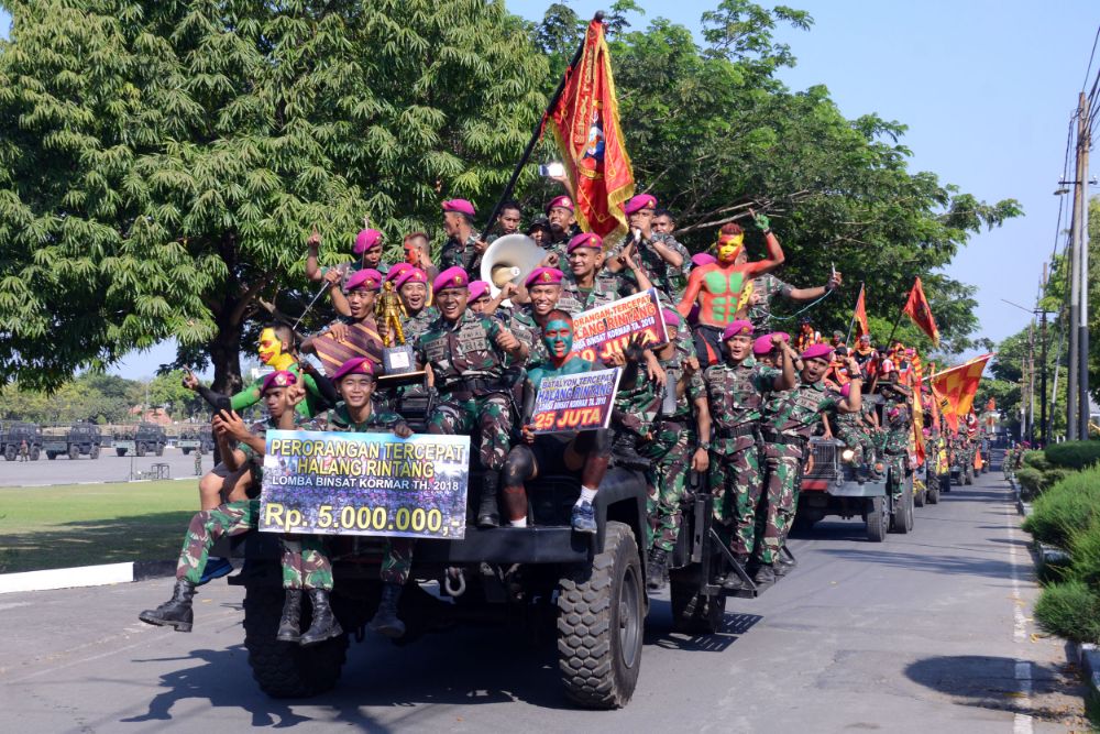 Usai apel khusus, seluruh pasukan menaiki kendaraan dan melakukan konvoi mengelilingi Kesatrian Marinir Sutedi Senaputra Karangpilang, Surabaya.