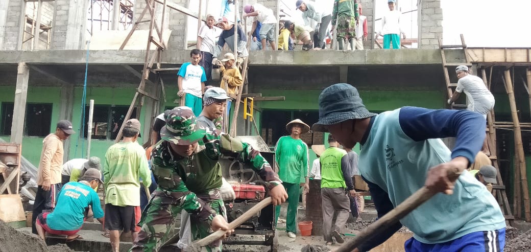 Nganjuk – Babinsa Desa Gemenggeng Srrka Subiantoro dan 5 orang anggota Koramil 0810/12 Pace Bersama masyarakat melaksanakan giat Karya Bhakti membantu pengecoran lantai atas Sekolah Madarasah Ibtidaiyah An Nur dalam rangka penambahan ruang kelas yang selama ini tidak bisa menampung siswa/wi di kelas, RT 02 RW 01 Dusun Klitik Desa Gemenggeng Kec. Pace, Nganjuk Sabtu 16/02/2019.