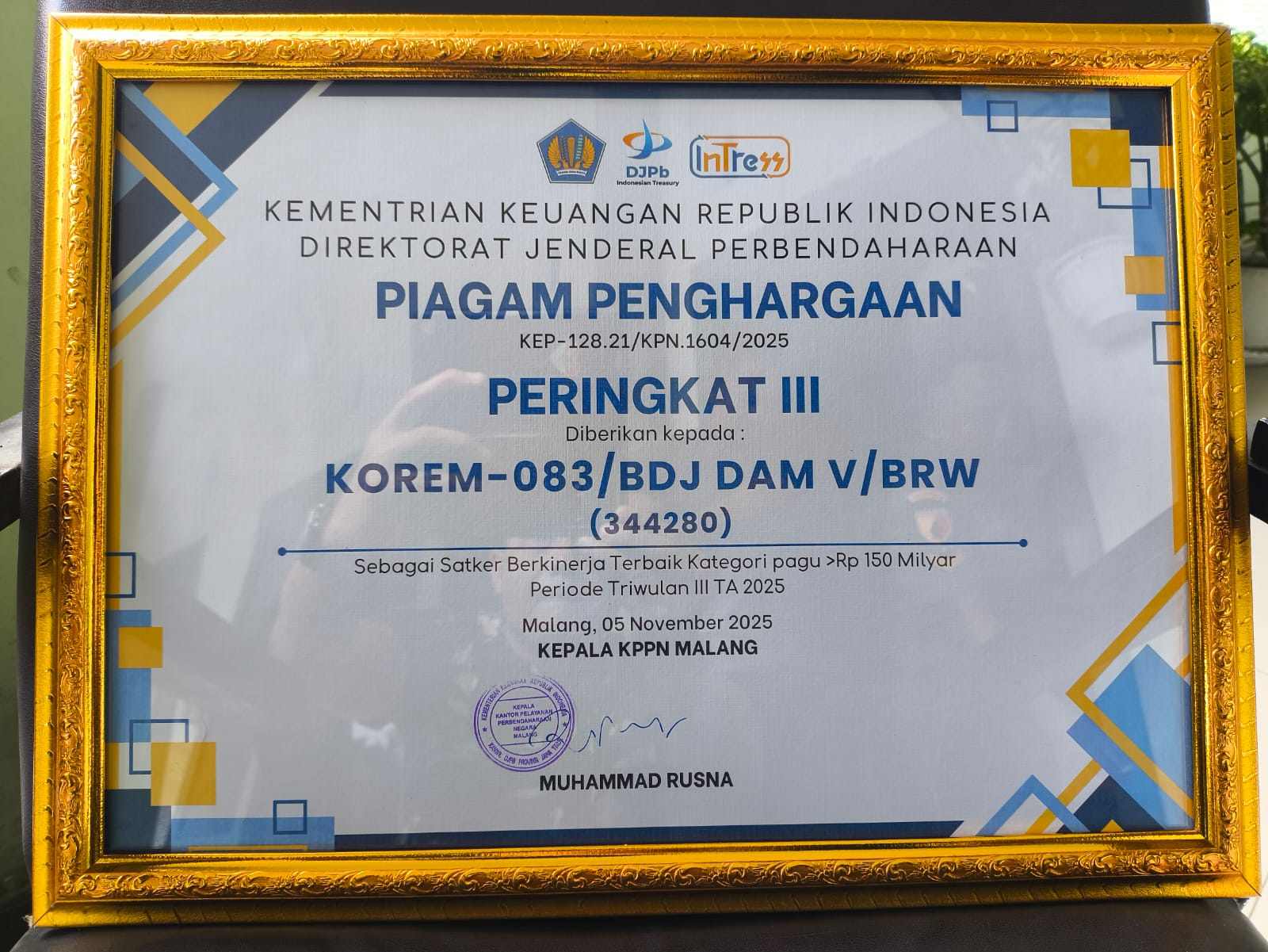Malang – Korem 083/Baladhika Jaya kembali mencatatkan kinerja positif dalam pengelolaan anggaran. Pada kegiatan Press Release APBN dan Penyerahan Penghargaan Satker Terbaik KPPN Malang Triwulan III Tahun 2025, Korem 083/Bdj berhasil meraih posisi peringkat III untuk kategori pagu anggaran Rp150 miliar. Acara digelar di Aula RCE Center Gedung Cagar Budaya KPPN Malang, Kamis (5/11/2025).