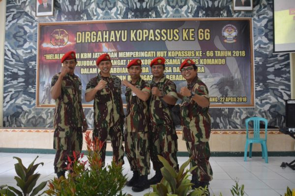 PB|Malang – Dalam rangka memperingati HUT ke-66 Komando Pasukan Khusus (Kopassus) tahun 2018, Prajurit TNI Korp Baret Merah menggelar acara Syukuran Hari Ulang Tahun (HUT) ke-66 Kopassus Tahun 2018 yang jatuh pada tanggal 16 April, bertempat di Aula Doktrin Pendidikan Kejuruan (Dodikjur) Rindam V/Brawijaya, Malang, Jawa Timur, Minggu (22/4/2018).