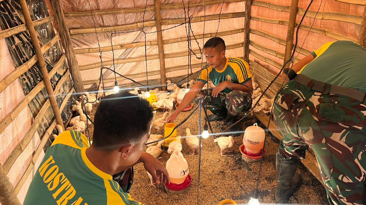 TTU – Satgas Pamtas RI-RDTL Sektor Barat Yonarhanud 2 Kostrad Pos Inbate melaksanakan program ketahanan pangan melalui budidaya peternakan ayam di Desa Inbate, Kecamatan Bikomi Nilulat, Kabupaten TTU, Rabu (08/04/2026).