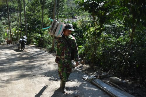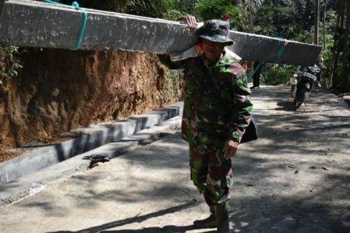 Banjarnegara – Adalah Peltu Ali Nuhyanto, anggota Satgas TMMD dari Makodim 0704 Banjarnegara, mengumpulkan bekisting betonisasi TMMD untuk cinderamata kepada orang tua asuhnya, Runtiyah (39) Dusun Kroya Rt/Rw. 3 Desa Pasegeran Kecamatan Pandanarum untuk digunakan memperbaiki dinding dapurnya.