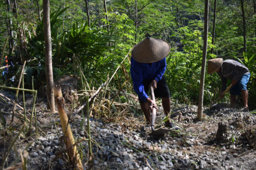 Bersama Sunardi (75) tetangganya, celana pendek biru, mereka mengumpulkan sisa-sisa bahan bangunan berupa batu split untuk digunakan menambal jalan masuk/gang menuju rumah.