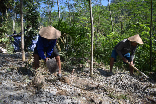Bersama Sunardi (75) tetangganya, celana pendek biru, mereka mengumpulkan sisa-sisa bahan bangunan berupa batu split untuk digunakan menambal jalan masuk/gang menuju rumah.