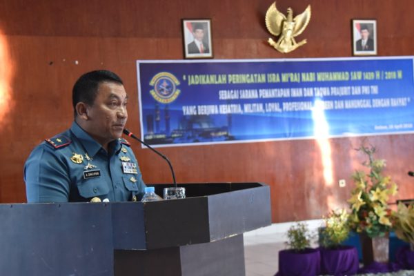 Selain itu Danlantamal IX juga menyampaikan tema peringatan Isra Mi’raj tahun ini yaitu “Jadikanlah peringatan Isra Mi’raj Nabi Muhammad SAW 1439 H/2018 M sebagai sarana pemantapan iman dan takwa prajurit dan PNS TNI yang berjiwa kesatria, militan, loyal, profesional, modern dan manunggal dengan rakyat”.