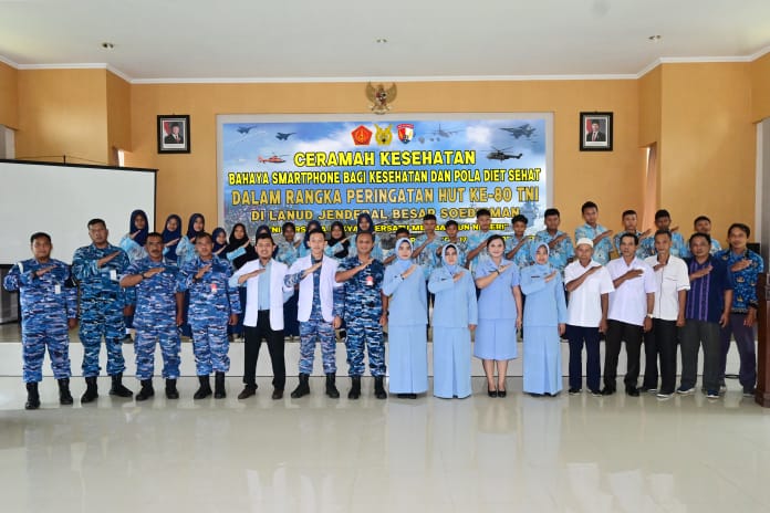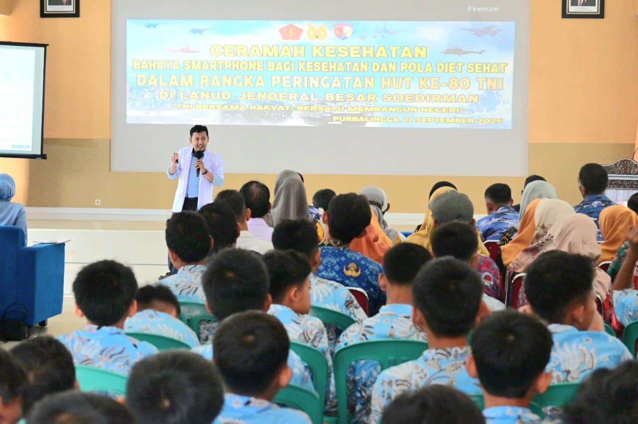 Purbalingga – Lanud Jenderal Besar Soedirman menggelar ceramah kesehatan, tentang bahaya smartphone bagi kesehatan dan pola hidup sehat, dalam rangka peringatan HUT Ke-80 Tentara Nasional Indonesia (TNI), sebagai narasumber dr. Fakhry M. Lutfi dari RS. Emanuel dan Kakes Lanud J.B. Soedirman, Lettu Kes dr. Edwin Oka Mustofa. Kegiatan dilaksanakan di Gedung Serba Guna Soewarno Lanud J.B. Soedirman, Purbalingga. Rabu (17/09/2025).