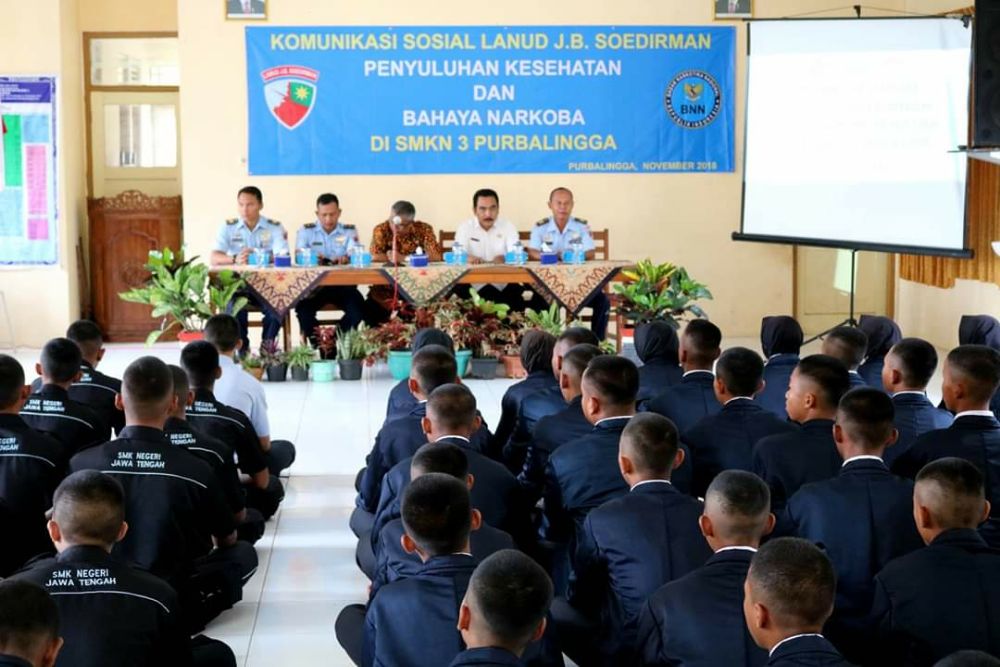Purbalingga – Lanud J.B. Soedirman bekerja sama dengan BNN Kabupaten Purbalingga, menggelar (Komsos) Komunikasi Sosial tentang Penyuluhan Kesehatan dan Bahaya Narkoba kepada ratusan siswa Sekolah Menengah Kejuruan Negeri 3 (SMKN 3) Kab. Purbalingga yang berlangsung di Aula SMKN 3 Purbalingga, Rabu (21/11). Hadir pada acara tersebut Kadisops Lanud J.B. Soedirman Mayor Tek Naharudin, A.Md., Kepala BNN Kab. Purbalingga Istantiyono, S.Sos., Kepala Sekolah SMKN 3 Kab. Purbalingga Juwani, M.Pd., Kakes Lanud J.B. Soedirman Kapten Kes Edi Soeprapto dan Kaurdukkes Lanud JB Soedirman dr. Yohan Parulian Sinaga serta para siswa SMKN 3 Purbalingga.