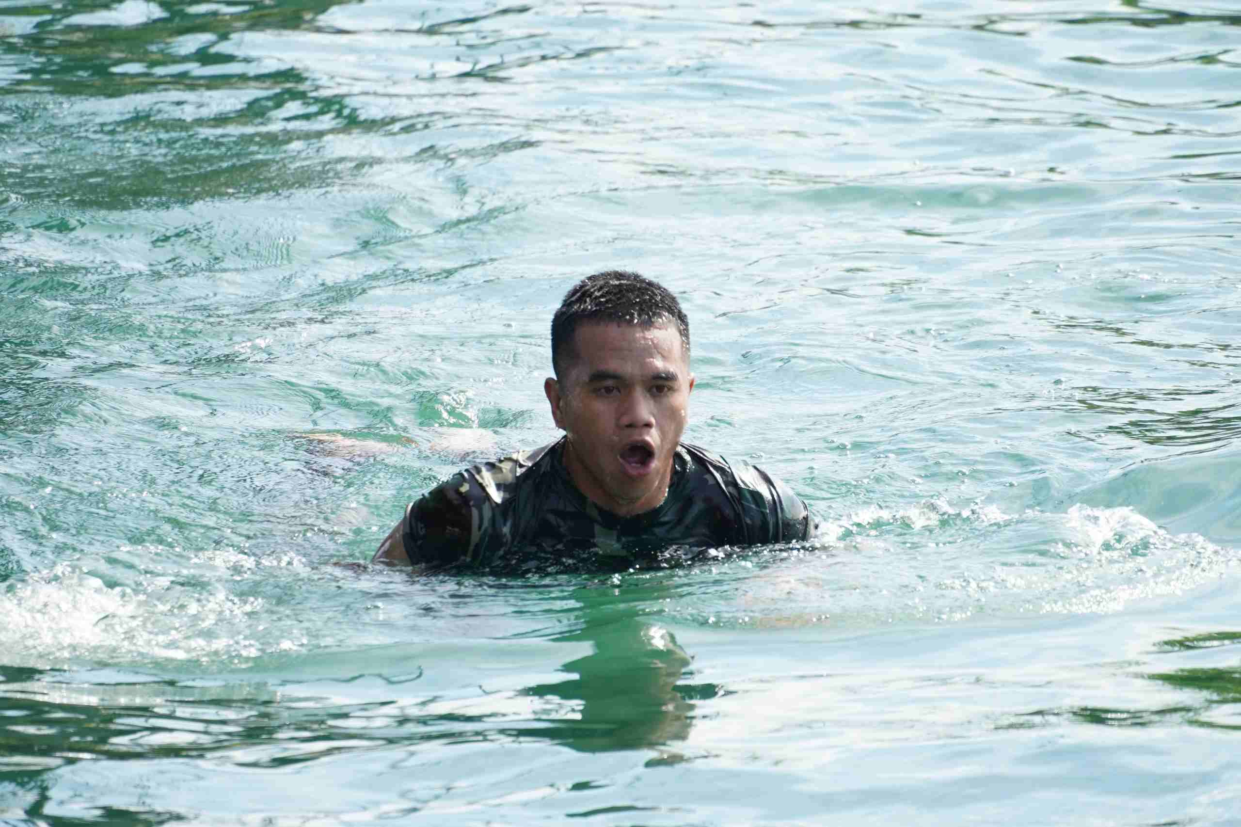 Sebelum pelaksanaan latihan renang laut, seluruh prajurit terlebih dahulu dicek kesehatannya oleh tim kesehatan dari Diskes Kodaeral XIV Sorong dan senam pemanasan, selanjutnya setiap prajurit turun ke perairan dermaga untuk melakukan penyesuaian dan secara bergilir melaksanakan latihan renang laut.