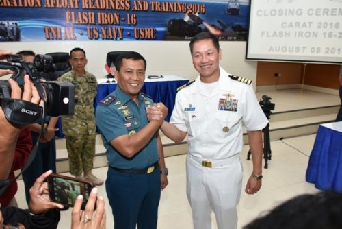 Selanjutnya dalam sambutan Asisten Operasi (Asops) Kasal Laksda TNI I.N.G.N Ary Atmaja, S.E., yang dibacakan oleh Pangarmatim menyampaikan bahwa, suatu kehormatan bagi saya dalam bagian terakhir latihan bersama Carat 2016 dan Flash Iron 16-2446 hari ini, beberapa hari yang lalu kita telah mencatatkan sejarah antara negara Indonesia dan Amerika.