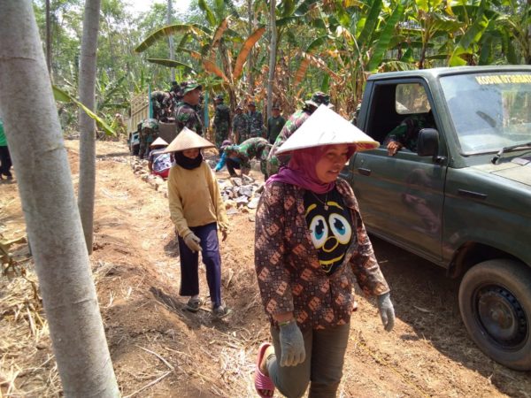 Mereka dengan sukarela dan penuh semangat ikut membantu memindahkan bongkahan bongkahan batu belah untuk pengerasan jalan (makadam) dalam pembangunan fisik pra TMMD reguler ke103 Kodim Batang tahun 2018.