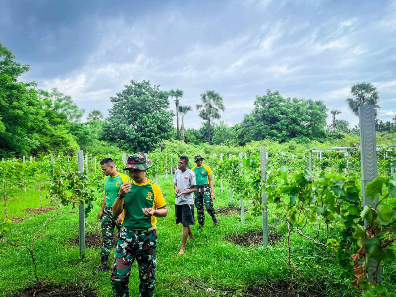 Danpos Wini, Sertu Bahar menyampaikan, “Melihat warga berhasil mengelola kebun anggur di wilayah pesisir seperti ini adalah prestasi. Kami hadir untuk memberikan semangat, karena ketahanan pangan adalah bagian dari pertahanan negara.”
