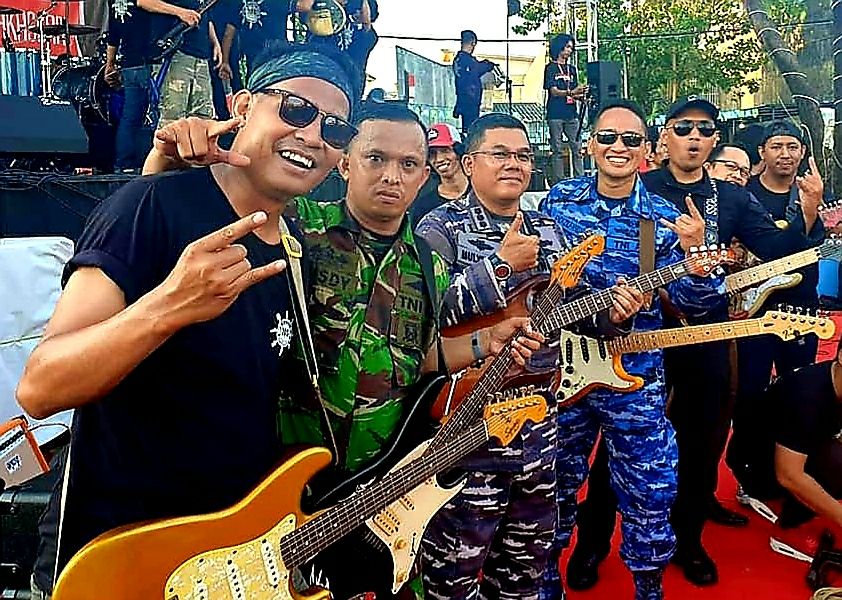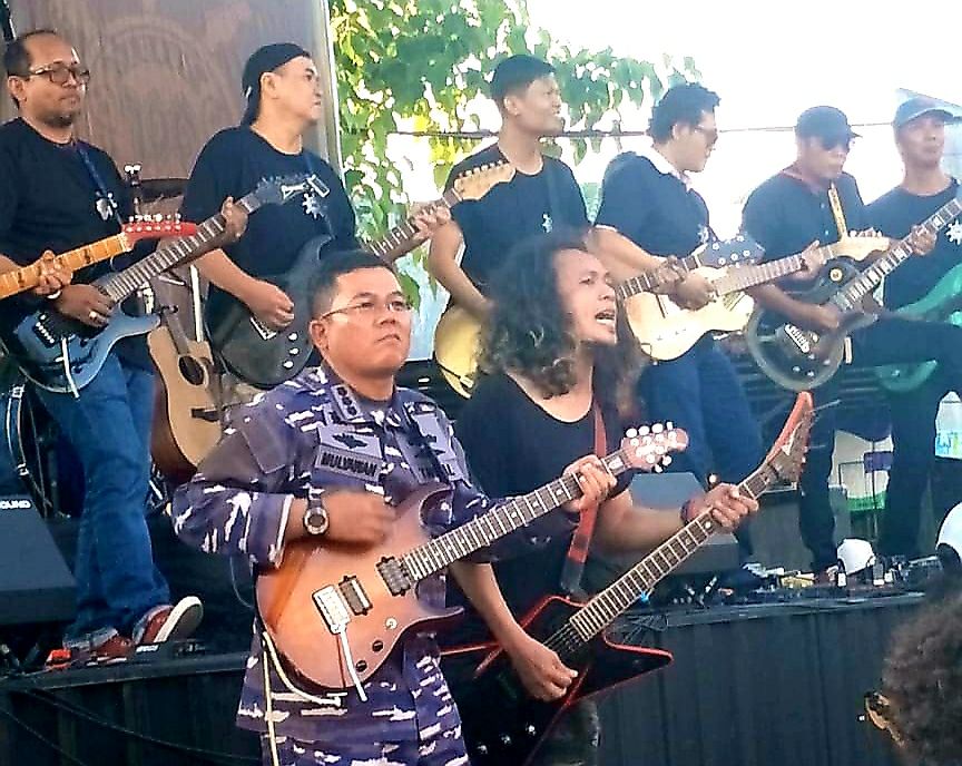 Makassar – Rabu,(10/7), Matros Band Lantamal VI perkuat sinergitas TNI-Polri dalam sebuah kreativitas seni bermusik bersama 100 gitaris kota Makassar. Pentas musik ini bertajuk “Reunion, Parade 100 Gitaris Kota Makassar”, Matros Band Lantamal VI yang dipimpin oleh Kolonel Laut(S) Mulyawan,SE., sukses tampil memukau bersama 100 gitaris di kawasan Pasar Segar, Panakkukang, Makassar pada hari Minggu sore tanggal 7 Juli 2019 lalu.