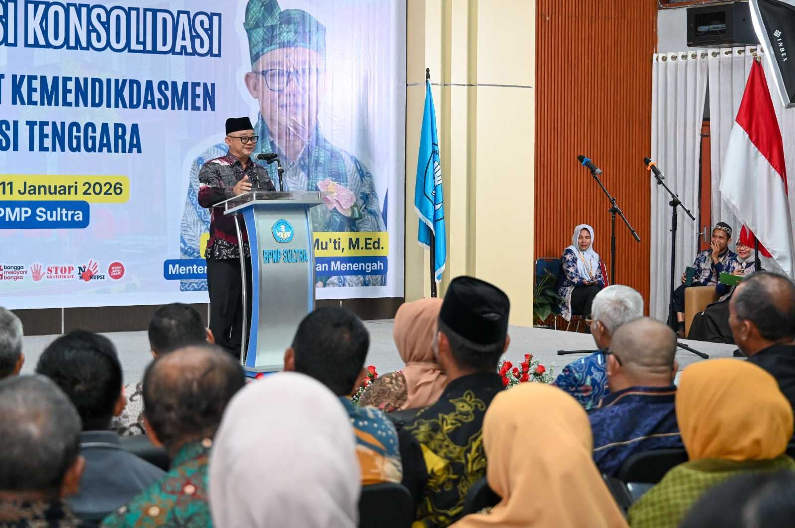 Kendari, 10 Januari 2026 – Menteri Pendidikan Dasar dan Menengah (Mendikdasmen), Abdul Mu’ti, menyampaikan apresiasi kepada Unit Pelaksana Teknis (UPT) Kementerian Pendidikan Dasar dan Menengah (Kemendikdasmen) serta pemangku kepentingan pendidikan lainnya di Provinsi Sulawesi Tenggara atas kontribusi nyata dalam mendukung peningkatan mutu layanan pendidikan di sepanjang tahun 2025.