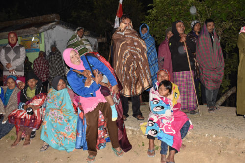 Sambil menggendong cucu tersayang Erlan (7) karena takut kedinginan, juga ikut menonton film yang diputar Satgas TMMD dan DPPKBP3A Kabupaten Banjarnegara.