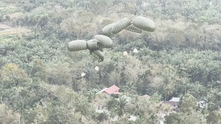 Dalam pelaksanaannya, pesawat angkut CN-295 dengan registrasi A-2904 diterbangkan dari Lanud Soewondo Medan. Setibanya di area drop zone, pesawat tersebut berhasil menerjunkan 90 helibox dengan total bobot 450 kilogram. Bantuan ringan ini ditujukan agar dapat segera dimanfaatkan oleh warga yang berada di titik-titik prioritas.