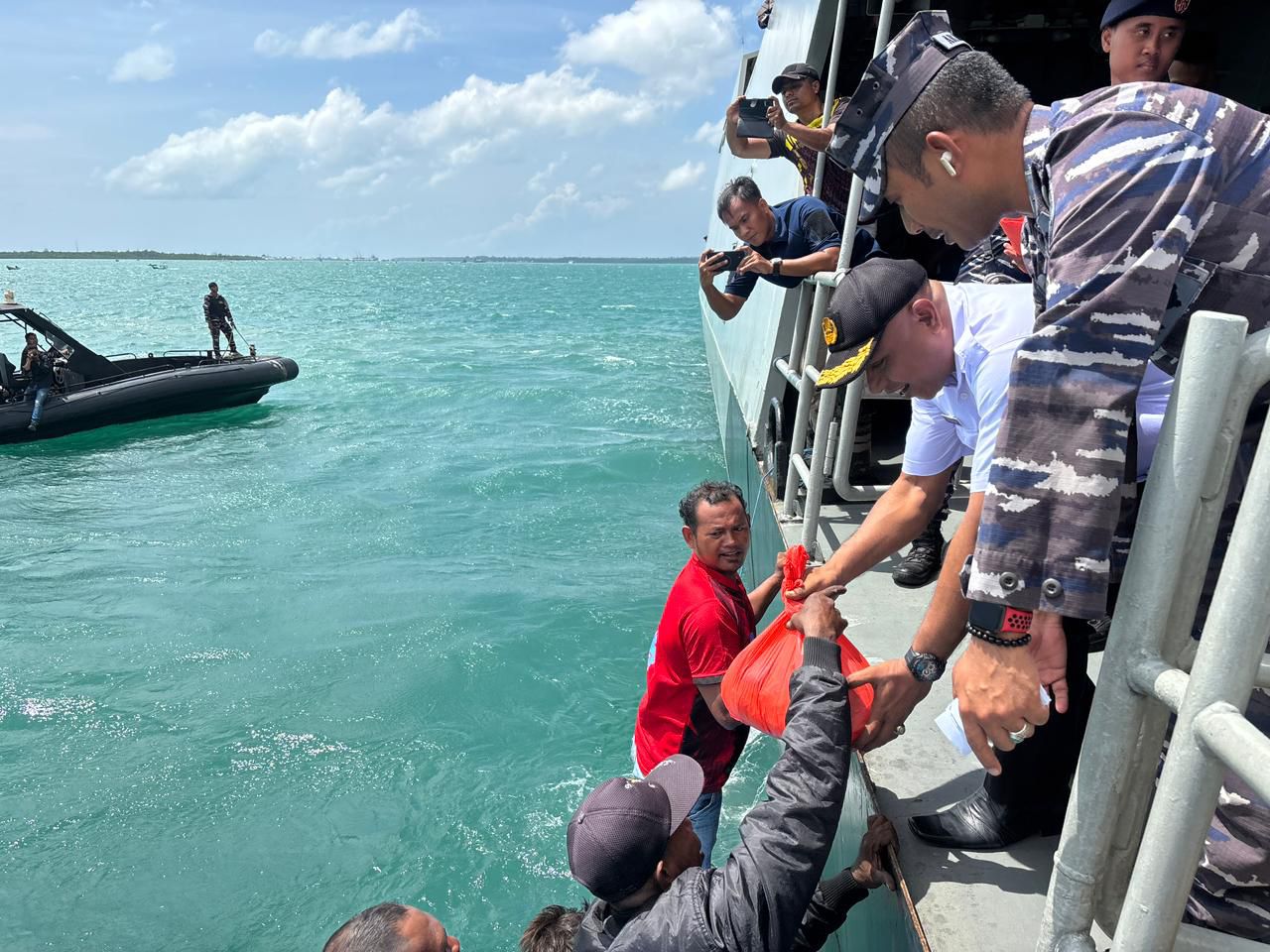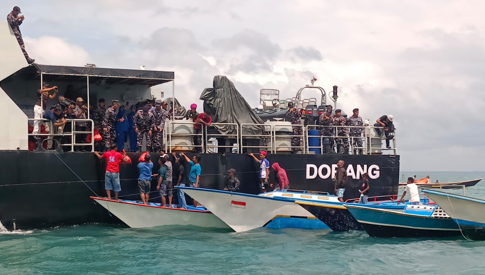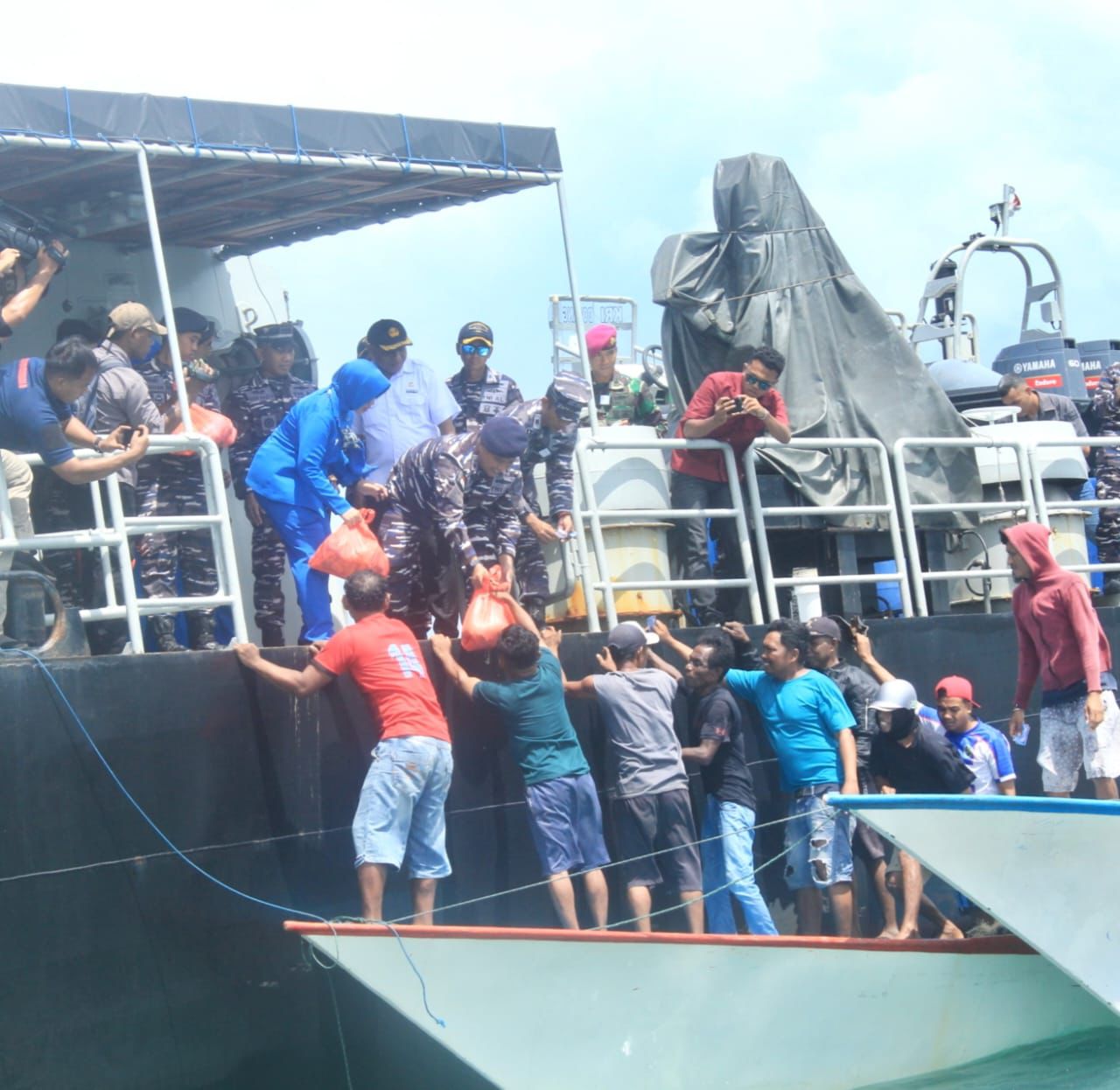 Kepulauan Aru – TNI AL mendistribusikan bantuan paket sembako kepada puluhan nelayan yang mendekati KRI Dorang-874 saat melaksanakan lego jangkar di perairan belakang Pulau Wamar, Kepulauan Aru, Rabu (4/3).
