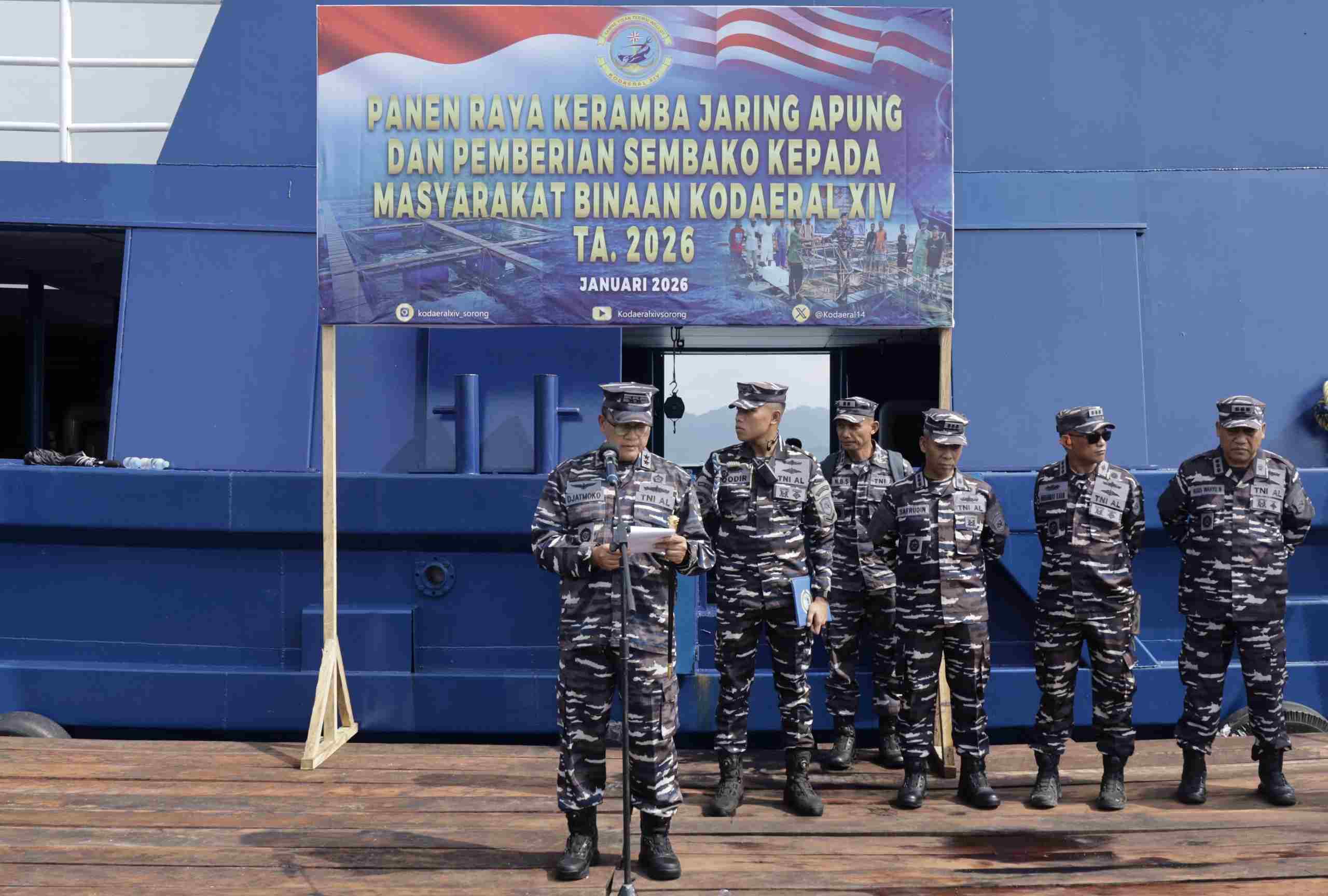 Sorong – Dalam rangka mengimplementasikan program Kampung Bahari Nusantara, sebagai wujud nyata komitmen TNI AL dalam membangun kampung pesisir yang tangguh, produktif, sehat, dan berdaya saing, Komandan Komando Daerah TNI Angkatan Laut XIV (Komandan Kodaeral XIV), Laksamana Muda TNI Djatmoko, S.T., M.M., CHRMP, melaksanakan kegiatan panen raya keramba jaring apung dan pemberian sembako kepada masyarakat binaan Kodaeral XIV. bertempat di Kampung Bianci, Distrik Waigeo Barat, Kabupaten Raja Ampat Provinsi Papua Barat Daya, Kamis (29/01/2026).