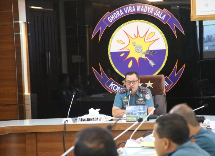 PB|Surabaya – Panglima Komando Armada (Pangkoarmada) II Laksamana Muda TNI Didik Setiyono, S.E., M.M. menerima paparan terkait kesiapan Komando Armada (Koarmada) II menjadi tuan rumah acara pengukuhan Ibu Manik Siwi Sukma Adji sebagai Ibu Catraratnanggadi Jalakanyasena (Ibu Pelindung dan Pembimbing Kowal), bertempat di ruang rapat Panglima, Senin (04/06/2018).