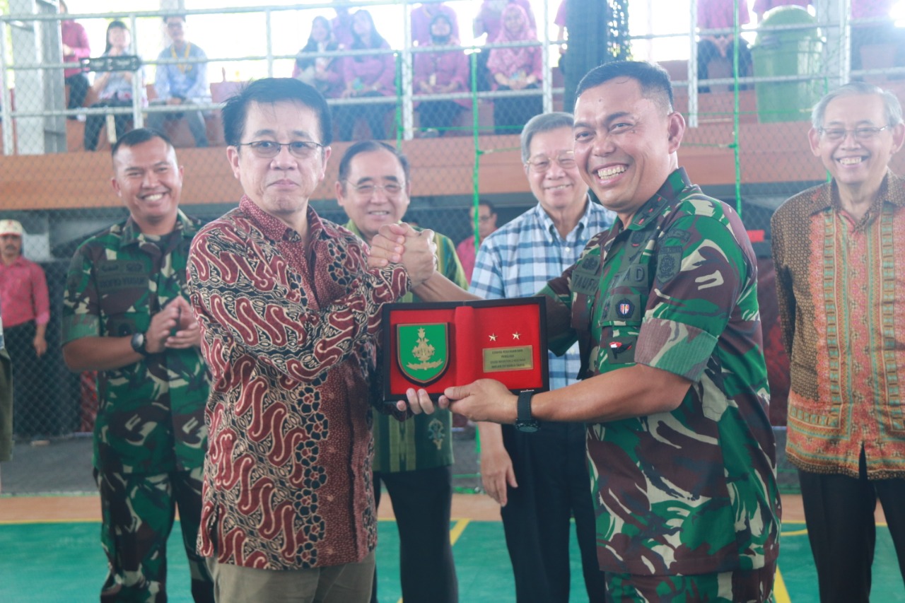 Surabaya – Mayjen TNI Marga Taufiq selaku Panglima Divisi Infanteri 2 Kostrad tandatangani prasasti untuk resmikan Ubaya Sports Center (USC). Selain prosesi penandatanganan, Rektor beserta tim futsal Universitas Surabaya (Ubaya) melaksanakan pertandingan futsal melawan tim dari Divif 2 Kostrad di Ubaya Sports Center Kampus Ubaya, Surabaya.