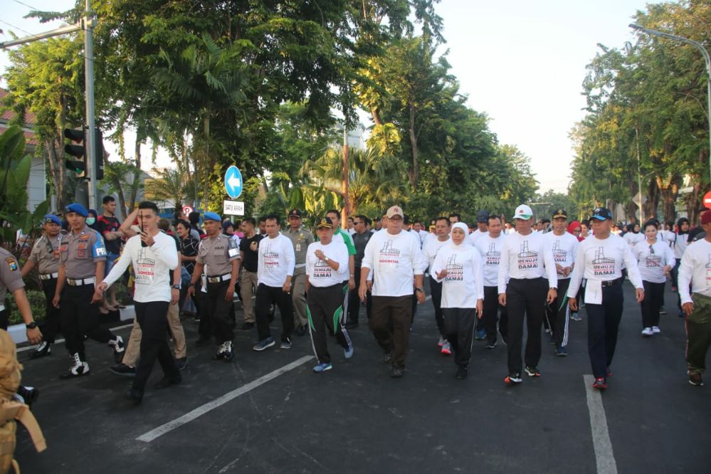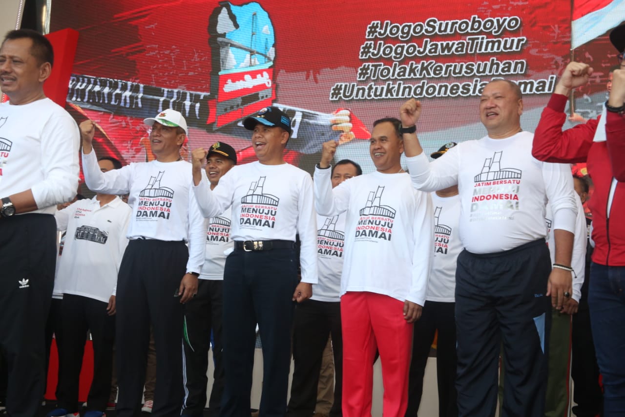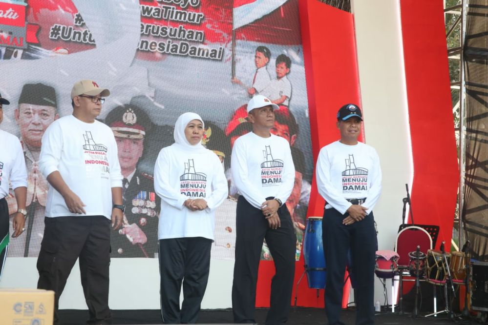 Dalam sambutannya Gubernur Jatim mengumandangkan slogan Kerusuhan No, Perdamaian Yes dan NKRI Harga Mati, yang juga terus dikumandangkan oleh jajaran Forum Koordinasi Pimpinan Daerah (Forkopimda) dan di ikuti ribuan peserta yang hadir.Selain itu ada pula hal lain yang tidak kalah menariknya pada acara tersebut, yakni Lomba Foto dan Vlog di Photo Booth bertajuk “Jatim Bersatu Indonesia Damai” yang diikuti seluruh lapisan masyarakat termasuk TNI dan Polri.