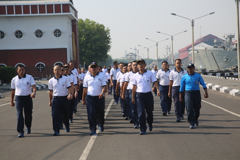 Surabaya – Panglima Komando Armada (Pangkoarmada) II, Laksamana Muda TNI Didik Setiyono, S.E., M.M., didampingi Ketua Daerah Jalasenastri Armada (KDJA) II Ny. Retno Didik Setiyono, mengikuti olahraga bersama Prajurit, PNS dan Jalasenastri jajaran Mako Koarmada II, bertempat di Dermaga Madura Ujung Koarmada II. Surabaya. Selasa (09/10/2018).