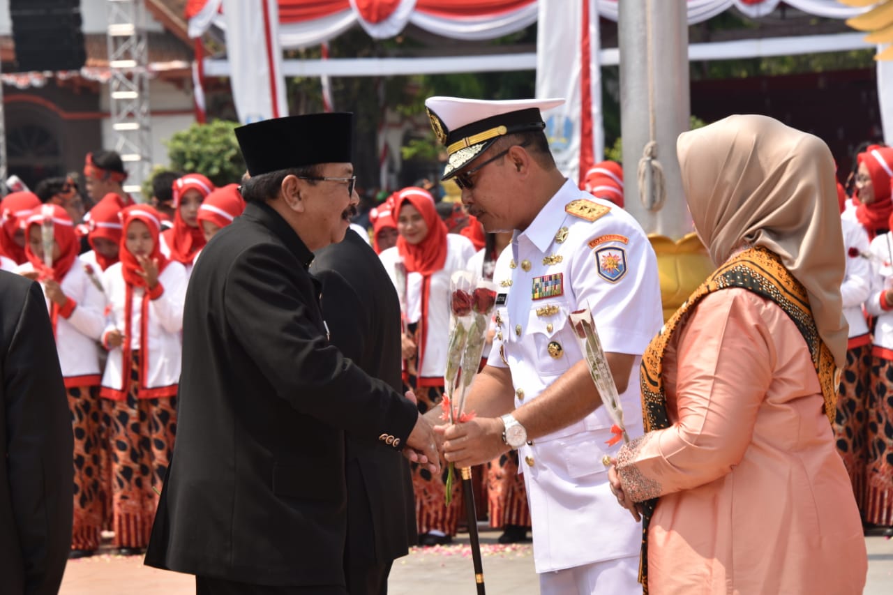 Surabaya –Panglima Komando Armada (Pangkoarmada) II, Laksamana Muda TNI Didik Setiyono, S.E., M.M., didampingi Ketua Daerah Jalasenastri Armada (KDJA) II, Ny. Retno Didik Setiyono menghadiri Upacara Peringatan Hari Jadi Provinsi Jawa Timur Ke-73 Tahun 2018, bertempat di Halaman Gedung Negara Grahadi, Jln. Gubernur Suryo No. 07, Surabaya. Jum’at (12/10/2018).