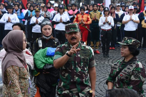 PB|Jakarta – Panglima TNI Marsekal TNI Hadi Tjahjanto, S.I.P. bersama Ketua Umum Dharma Pertiwi dan para Asisten Panglima TNI serta Kabalakpus TNI menghadiri Gladi Bersih Upacara Militer Apel Bersama Wanita TNI, Polwan dan wanita komponen bangsa, yang bertemakan “Wanita Indonesia Bersatu Terwujud Pertahanan Negara Yang Tangguh”, bertempat di Lapangan Monas, Jakarta Pusat, Selasa (24/4/2018).