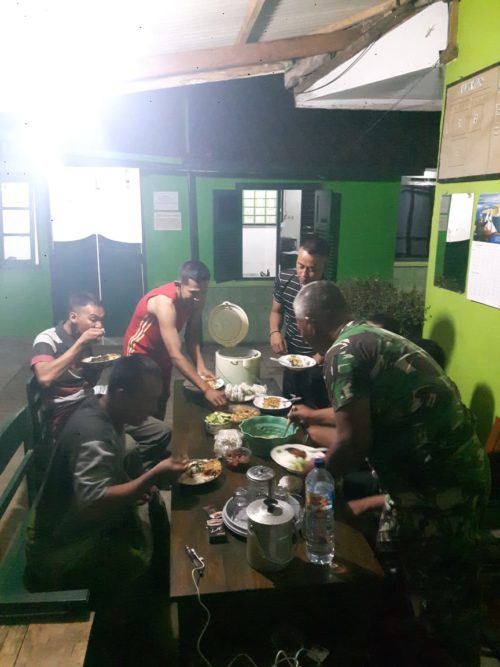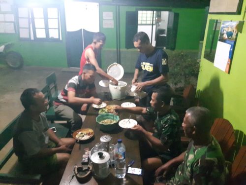 Dalam pelaksanaan TMMD personel yang tergabung dalam Satgas sebagian besar sudah memiliki keluarga, namun semangat dan kinerja mereka tidak diragukan lagi dalam mendukung suksesnya program TMMD, kekompakan tersebut terlihat ketika mereka tengah istirahat dan makan malam di Makoramil Subah, Selasa (16/10/2018) malam.