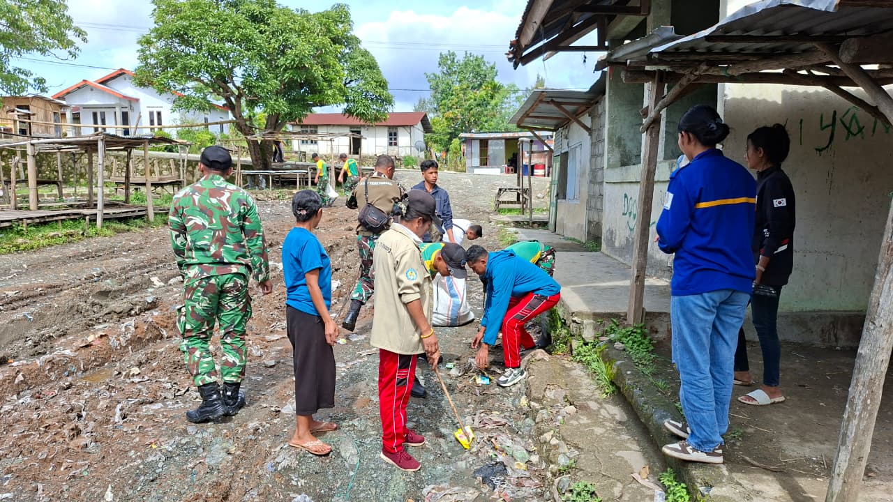 TTU – Makosatgas Pamtas RI-RDTL Sektor Barat Yonarhanud 2 Kostrad melaksanakan kegiatan Karya Bakti pembersihan lingkungan bersama masyarakat di Pasar Desa Sallu, Kecamatan Miomaffo Barat, Kabupaten TTU, Sabtu (28/02/2026).