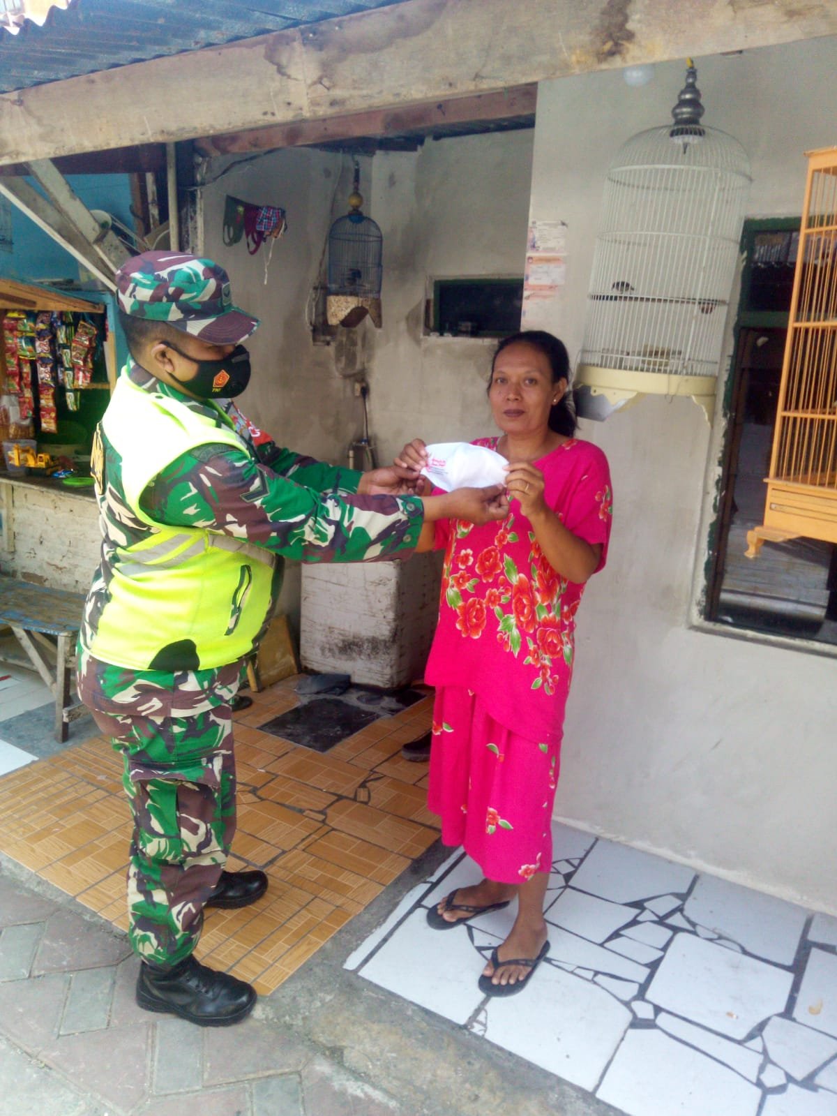 Dalam rangka memutus mata rantai covid – 19, Babinsa Koramil 01/Simokerto melaksanakan pembagian masker guna memutus mata rantai penyebaran Covid-19 yang sedang mewabah saat ini. Hal ini dilakukan sebagai bentuk kepedulian juga tugas sebagai Satgas Penanggulangan Covid-19.