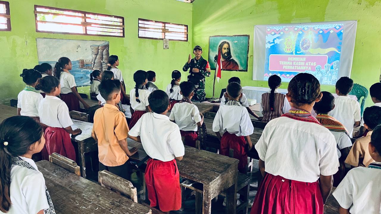 TTU – Satgas Pamtas RI-RDTL Sektor Barat Yonarhanud 2 Kostrad Pos Napan Bawah menggelar kegiatan Penyuluhan Pendidikan Wawasan Kebangsaan dan Bela Negara yang dilaksanakan di SD Katolik Tes, Desa Napan, Kecamatan Bikomi Utara, Kabupaten TTU, Senin (15/12/2025).