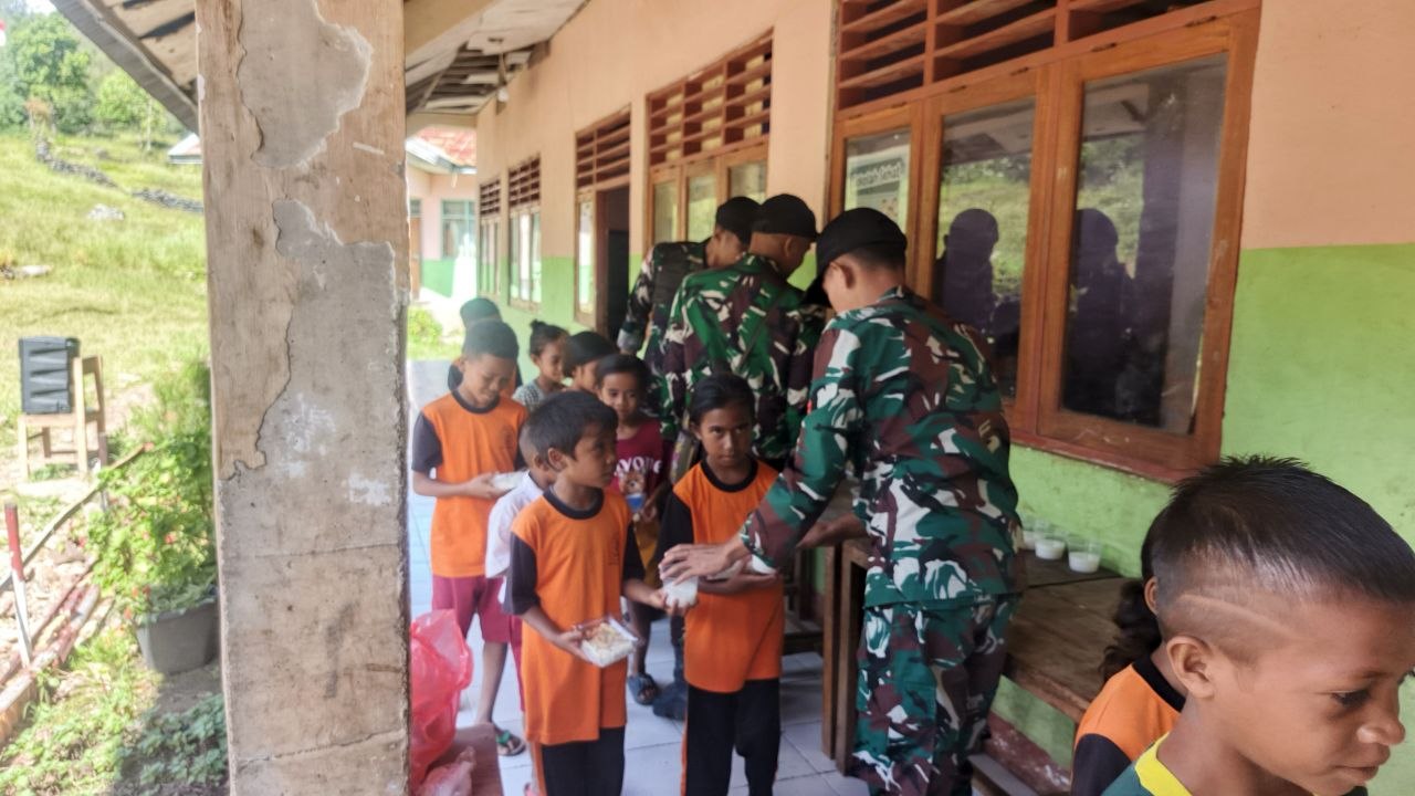 Kegiatan ini merupakan bentuk kepedulian Satgas Pamtas terhadap generasi muda, khususnya dalam mendukung tumbuh kembang anak melalui asupan gizi yang cukup dan seimbang. Dengan penuh semangat, para personel Satgas berinteraksi langsung dengan siswa-siswi, menciptakan suasana hangat dan penuh kebersamaan.