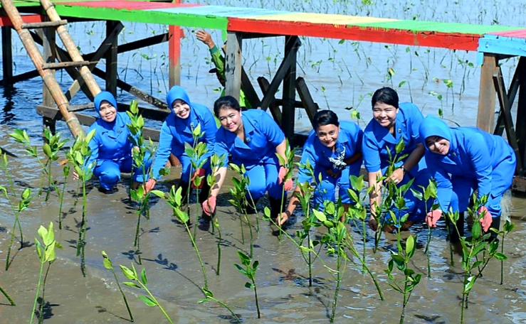 Makassar – Sebagai bentuk kepedulian terhadap lingkungan wilayah pesisir, Ketua Koordinator Cabang (Korcab) VI Daerah Jalasenastri Armada (DJA) II Ibu Risanti Dwi Sulaksono bersama pengurus menanam 1000 pohon mangrove di kawasan hutan mangrove Lantebung yang berada di pesisir utara kota Makassar tepatnya di Desa Lantebung, kelurahan Bira, Kecamatan Tamalanrea Makassar Selasa 2/4/2019.
