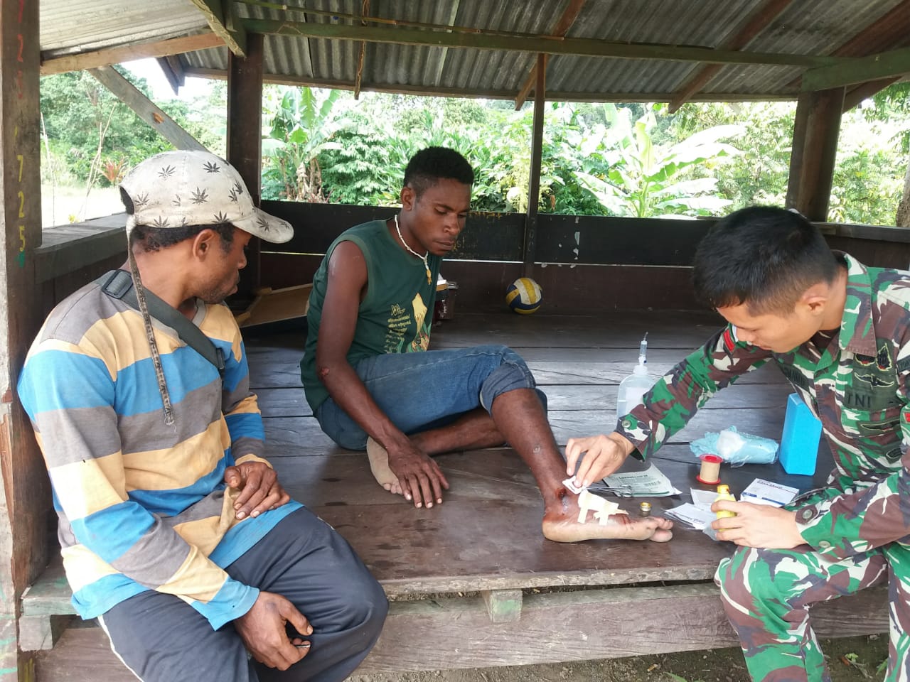 Pratu Ojak Boang Manalu beserta 1 orang anggota tim kesehatan langsung bergerak cepat menyiapkan peralatan medisnya untuk melakukan pertolongan pertama kepada Ezikel Swo (18). “Tim kesehatan melakukan perawatan dan membersihkan luka tangan dan kaki korban untuk diobati agar lekas sembuh,” tutur Henry.