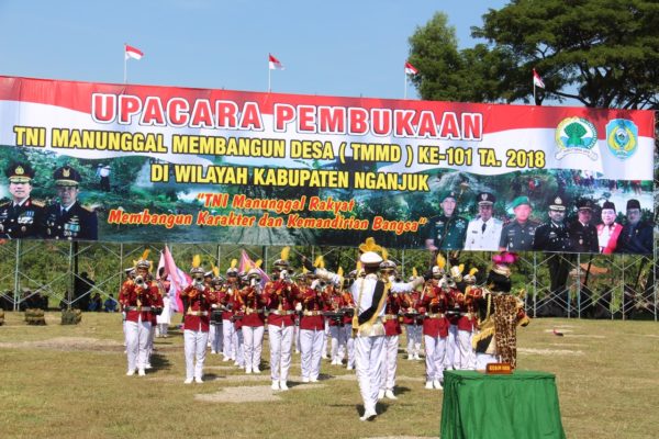 PB|Nganjuk – Upacara pembukaan TMMD ke 101 TA. 2018 di wilayah kecamatan Ngluyu kabupaten Nganjuk berlangsung meriah, Rabu ( 04/04 ). Sebelum upacara dimulai terlebih dahulu diperagakan beberapa atraksi diantaranya drumband dan seni jaranan yang berkolaborasi dengan pencak silat.