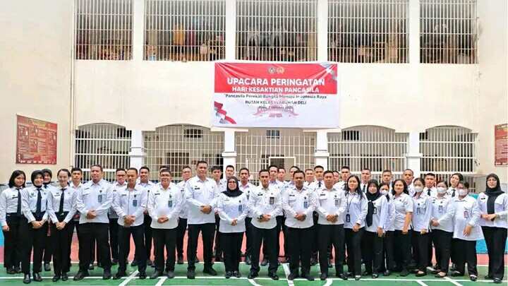 Labuhan Deli, Rabu – Rumah Tahanan Negara (Rutan) Kelas I Labuhan Deli menggelar upacara bendera dalam rangka memperingati Hari Kesaktian Pancasila yang jatuh pada tanggal 1 Oktober 2025. Kegiatan ini dilaksanakan di lapangan blok hunian Rutan dengan mengusung tema “Pancasila Perekat Bangsa Menuju Indonesia Raya.”