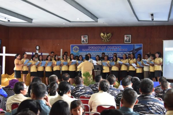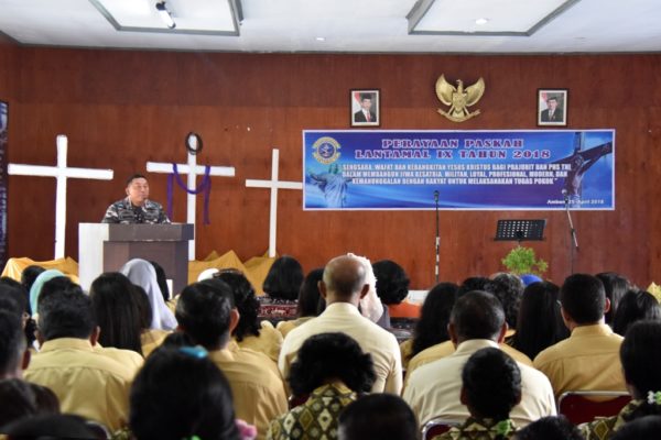 PB|Ambon – Personel Militer dan Pegawai Negeri Sipil (PNS) Pangkalan Utama TNI Angkatan Laut (Lantamal) IX Ambon merayakan Hari Raya Paskah atau hari Kebangkitan Yesus Kristus tahun 2018 dengan tema “ Sengsara, Wafat Dan Kebangkitan Yesus Kristus Menjadi Sumber Motivasi Bagi Prajurit dan PNS TNI Dalam Membangun Jiwa Kesatria, Militan, Loyal, Profesional, Modern Dan Kemanunggalan Dengan Rakyat Untuk Melaksanakan Tugas Pokok”. Kegiatan dilaksanakan di Gedung Manggala Loka Lantamal IX, Rabu (25/04/2018).