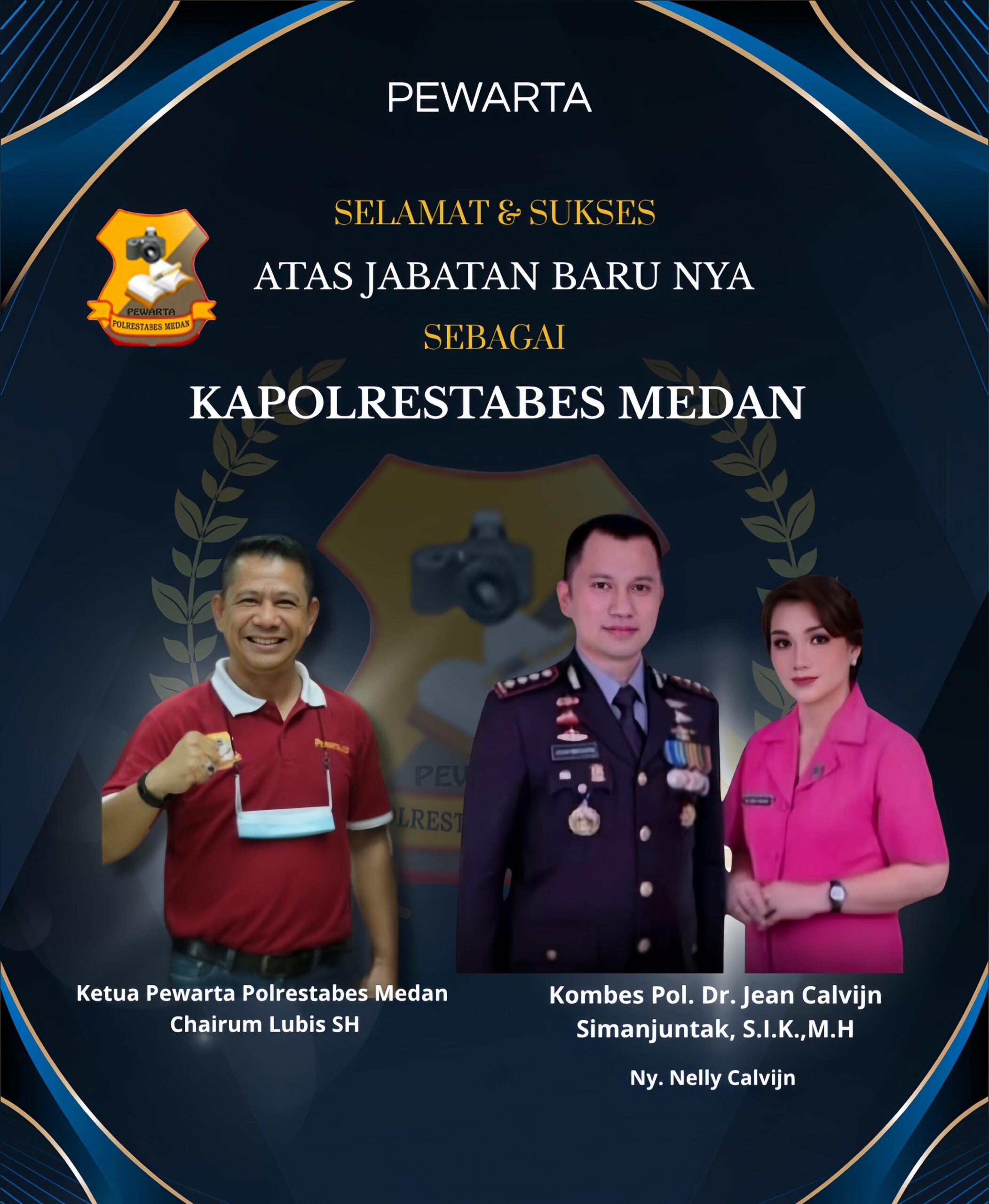 Medan — Pewarta Polrestabes Medan menyambut hangat dan penuh optimisme atas pengangkatan Kombes Pol Dr. Jean Calvijn Simanjuntak, S.I.K., M.H. sebagai Kapolrestabes Medan yang baru. Bentuk dukungan ini disampaikan langsung oleh Ketua Pewarta Polrestabes Medan, Chairum Lubis, S.H.