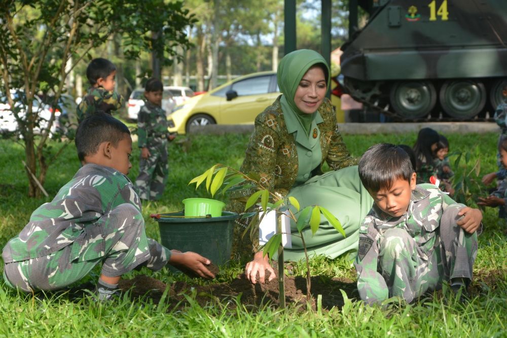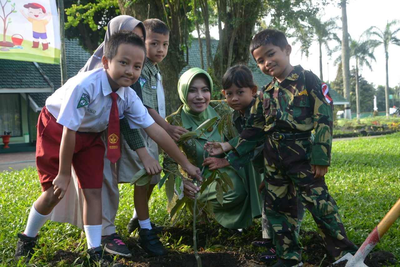 Sementara itu, dalam Sambutannya Ny. Tri Yuniarto menyampaikan ucapan terimakasih kepada panitia penyelenggara sehingga kegiatan ini dapat terlaksana dengan baik dan diharapkan kegiatan tersebut tidak hanya bersifat seremonial tapi akan menjiwai pada diri kita semua. “Kegiatan ini merupakan kegiatan edukasi untuk anak, agar mereka peduli dan menjaga kelestarian lingkungan dengan menanam pohon”, jelasnya.