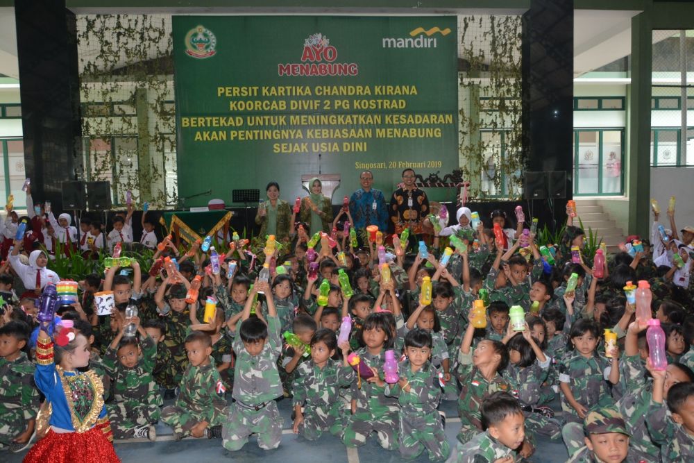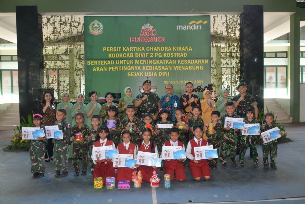 Berkaitan dengan hal tersebut Ketua Persit KCK Koorcab Divif 2 PG Kostrad, Ny. Ria Tri Yuniarto beserta anggota Persit dan 750 siswa siswi TK dan SD di wilayah Malang menghadiri acara pencanangan gemar menabung yang diselenggarakan di Markas Divif 2 Kostrad, Singosari, Malang. Selasa (20/2/19).