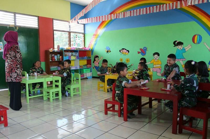 Sukoharjo – Anggota Persit bekerja sama dengan para guru TK Kartika Yonif Mekanis Raider 413/Bremoro Kostrad melatih murid-muridnya untuk menjaga lingkungan sekolah dengan melakukan diet kantong plastik, Rabu (06/02/2019).
