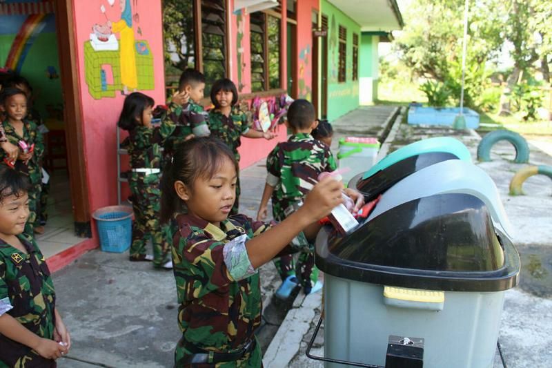 Anggota Persit, guru dan murid terlibat langsung dalam menjaga lingkungan sekolah TK Kartika Yonif Mekanis Raider 413/Bremoro Kostrad dari sampah yang dapat menganggu kebersihan dan keindahan.